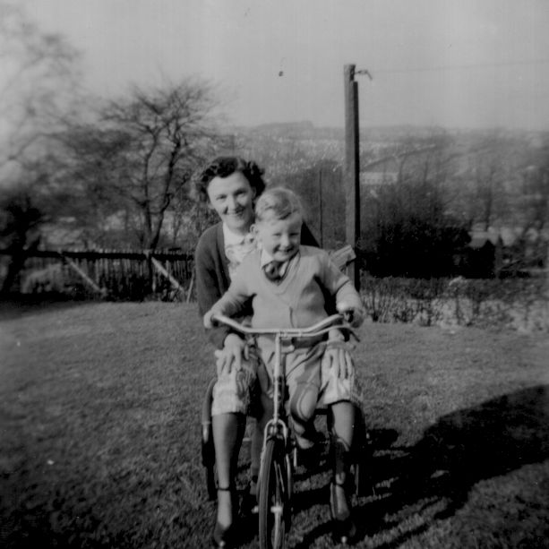 A photo of young Tizer sharing his tricycle with Mum in the back garden of their council house.