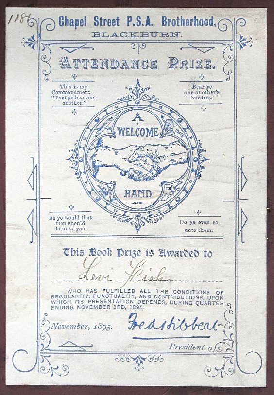 PSA Brotherhood prize, 1895, presented to Levi Fish of Blackburn