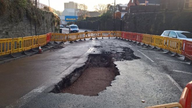 Damage caused by burst water pipe to A4 Bath Road, Bristol, December 2016.