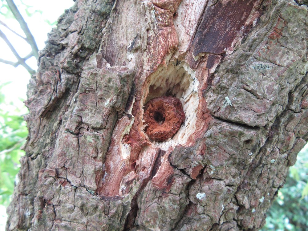 Hole in tree made by woodpecker to hold an object for `drilling'