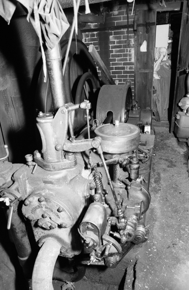 The gas engine at Berry's wood yard at Sough in 1989. It was run on producer gas made from waste wood and sawdust.