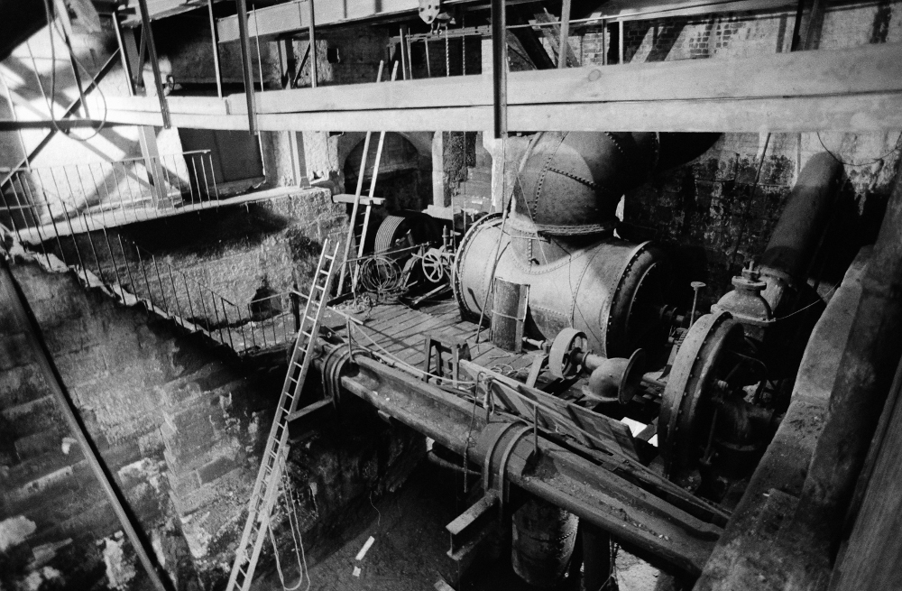 Water turbines at Quarry Bank Mill Styal in 1982. Note the old waterwheel shaft used as a support for the platform.