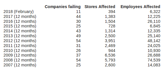 UK company failures - from Centre for Retail Research