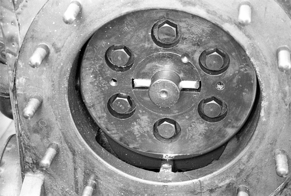The high pressure piston in the Queen Street Mill engine at Haggate in 1979. New piston rings had been fitted.