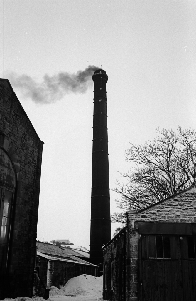 Bancroft chimney in snow winter 1977. I confess I got John to close the dampers a bit so we got some authentic smoke!