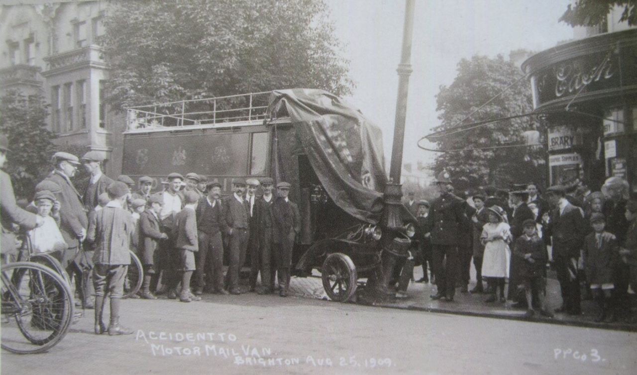 Postcard image of a mail van crash