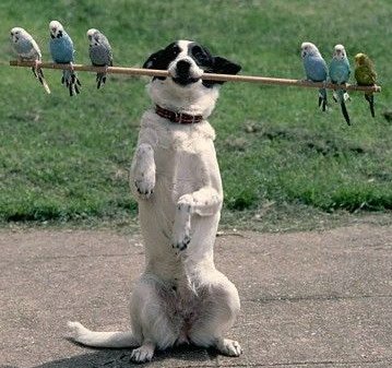 dog with budgies on a stick