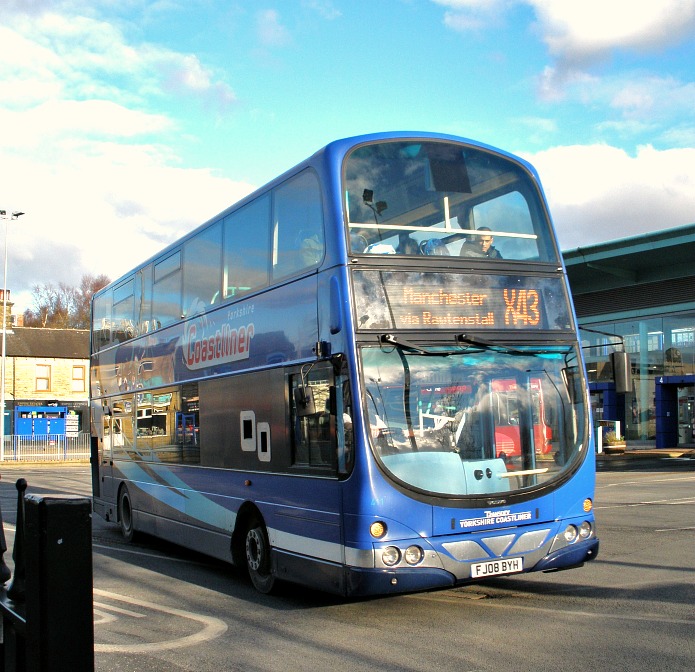 Transdev Yorkshire Coastliner double-decker on loan to Transdev Burnley & Pendle. Volvo FJO8 BYH. Seen here leaving Nelson bus/rail interchange on the X43 service to Manchester.