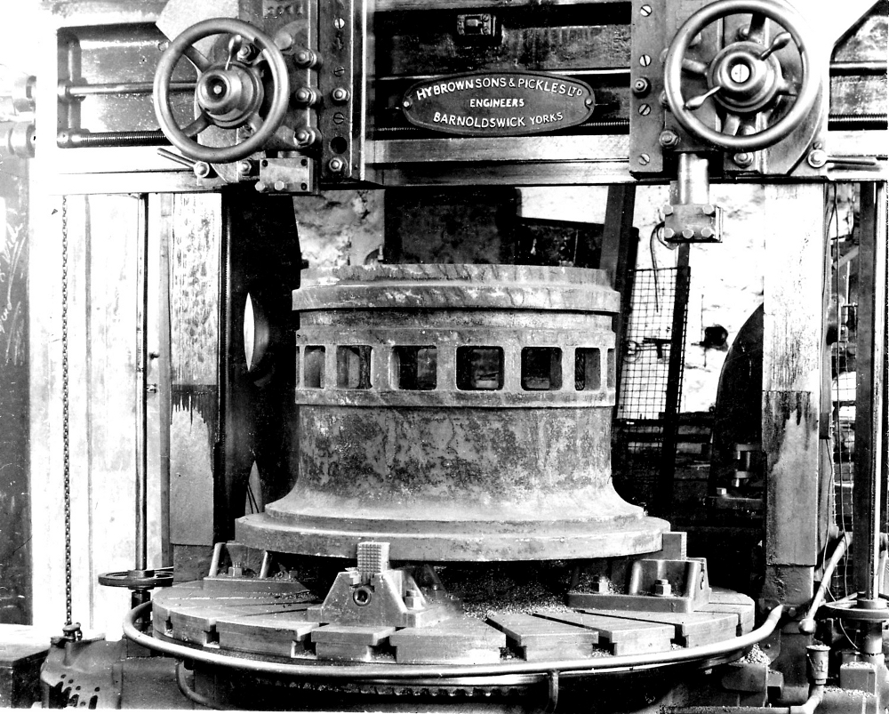 The Bullard borer being used by Brown and Pickles in the 1930s to bore a liner for an Edward's air pump.
