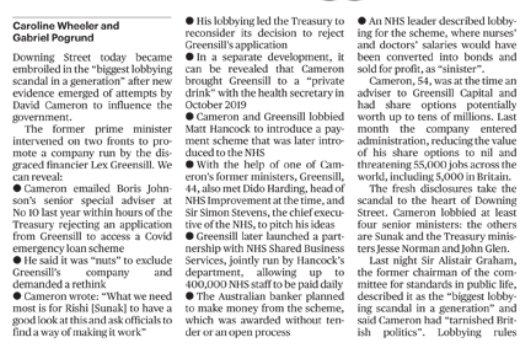 Cameron/Greensill info, Sunady Times front page, 11/04/21
