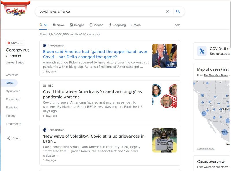 Google page with search for: covid news america