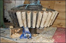 Wooden teeth in a cast iron wheel for a water mill.