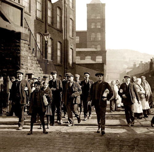 Workers leaving the mill