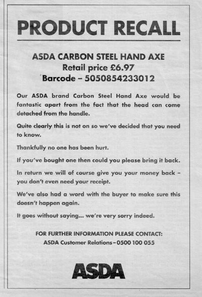 Asda product recall of hand axe