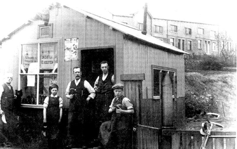 Jim Marsh (extreme left) and his clogger's shop at Dam Head. This pic is in Barnoldswick, a century of change and was brought to my attention by Rodney Birtwistle of Barnoldswick.