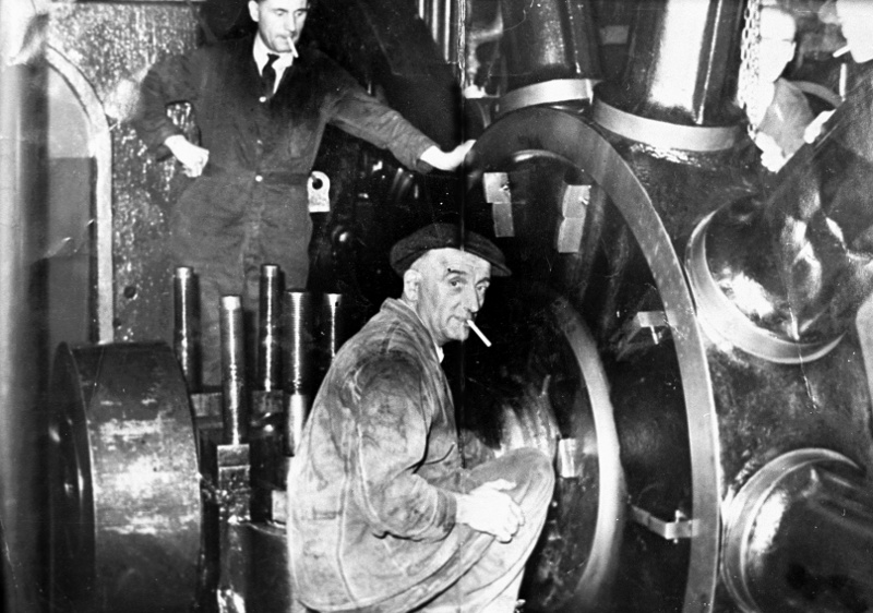 Harry Crabtree poking his two foot rule through the crack in the Victoria shaft. Newton Pickles stood at the back of the shaft with a fag in.