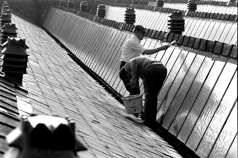 Whitewashing the shed windows.