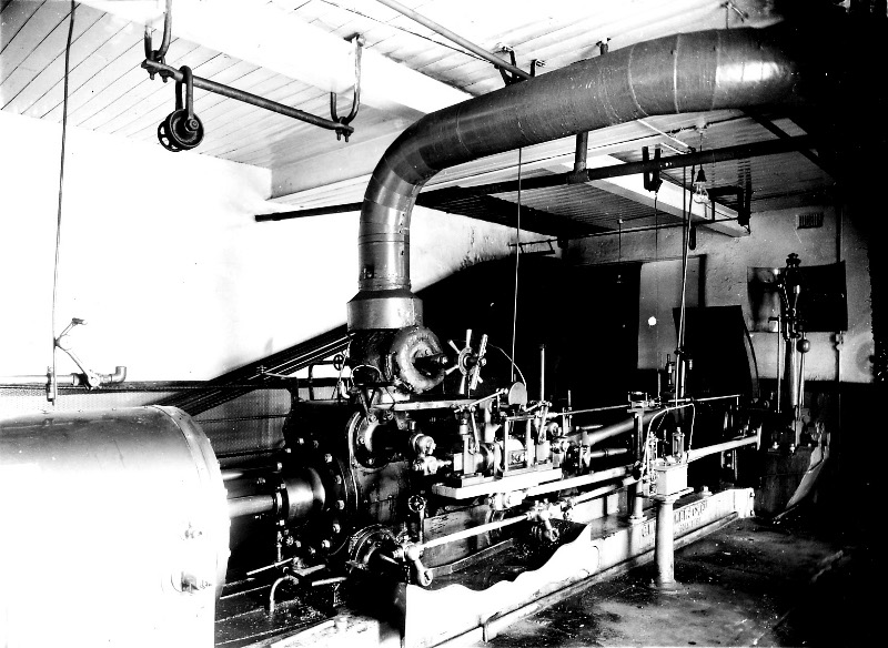 George Watkins pic of the engine at J E Elliott Limited, Holme Shed, Blacko. Built by C Whittaker and Company of Accrington who later maqde brickmaking plant. Corliss HP, 14" and slide valve LP, 27" X 2ft stroke. Steam from an Anderton boiler with superheater. Plant scrapped when mill closed in 1959.