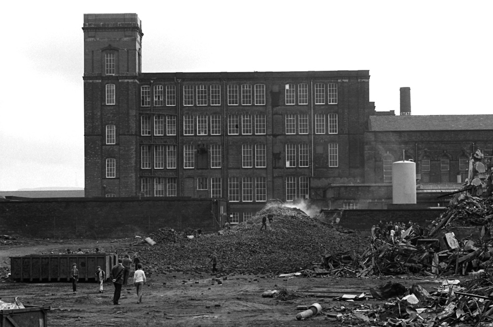 Moss chimney at Rochdale reduced to rubble in 1979.