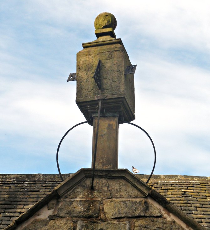 This ornate sundial above the porch of Colne Parish church (St Bartholomew's) is a rare find. Thought to have been placed here in the Victorian period, it replaced an earlier finial (spire or stone ornament). The present-day church dates from the 16th century but an earlier church of a 12th-century date stood on this site. There are many interesting grave-slabs in the churchyard, including some from the early 17th-century. Two cross-slabs in the porch are from an even earlier date, perhaps 13th century ?