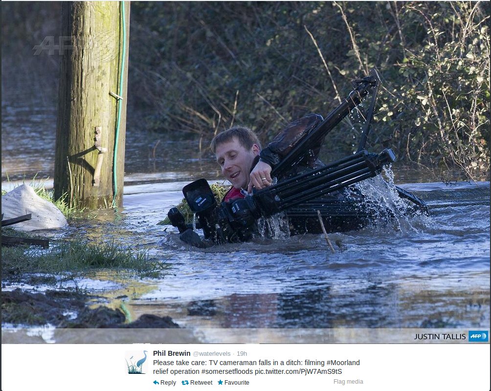 Cameraman falls in flood