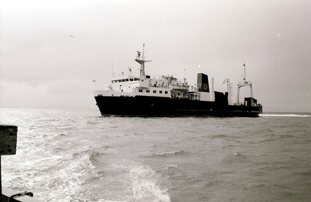 The Calmac ferry Pioneer off Eigg in 1988