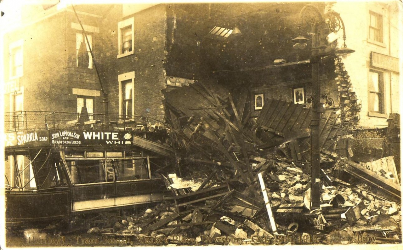 RP(real photograph) ,by Hartley, Dewsbury. Postcard of Tram Smash, Market Place, Dewsbury, Oct12th 1915 O/S view of tram embedded in the remains of Scarboro' Hotel, Dewsbury