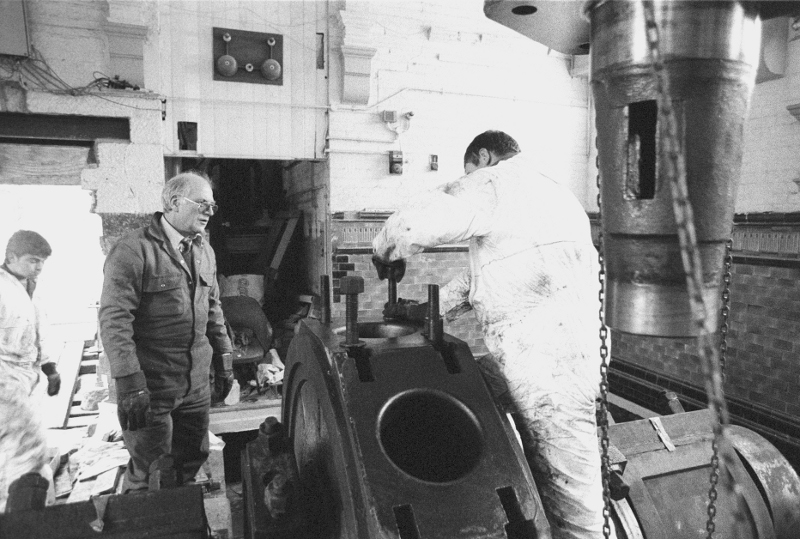 Terry Gissing supervising the rebuilding of the Jubilee flywheel at Masson Mill.