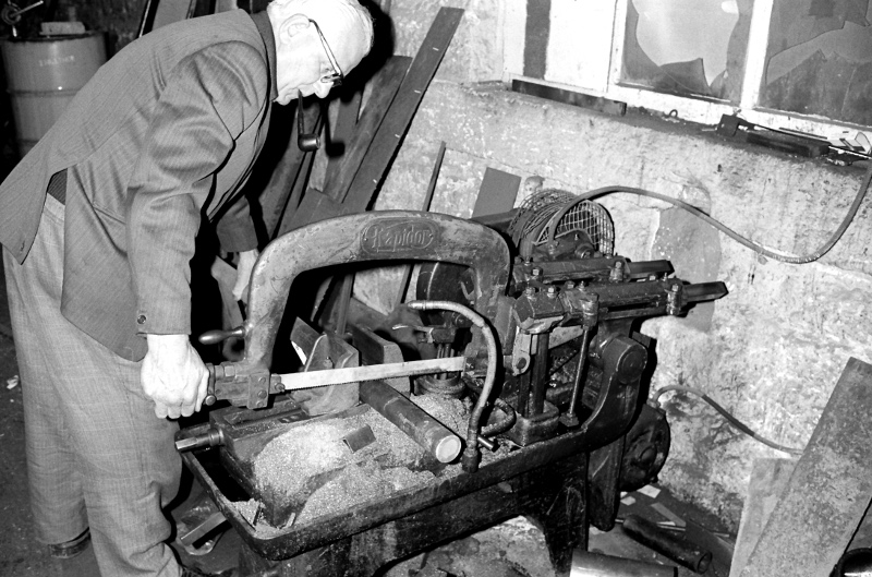 Newton Pickles using the Rapidor saw in the thoroughfare at Wellhouse Mill in 1978.