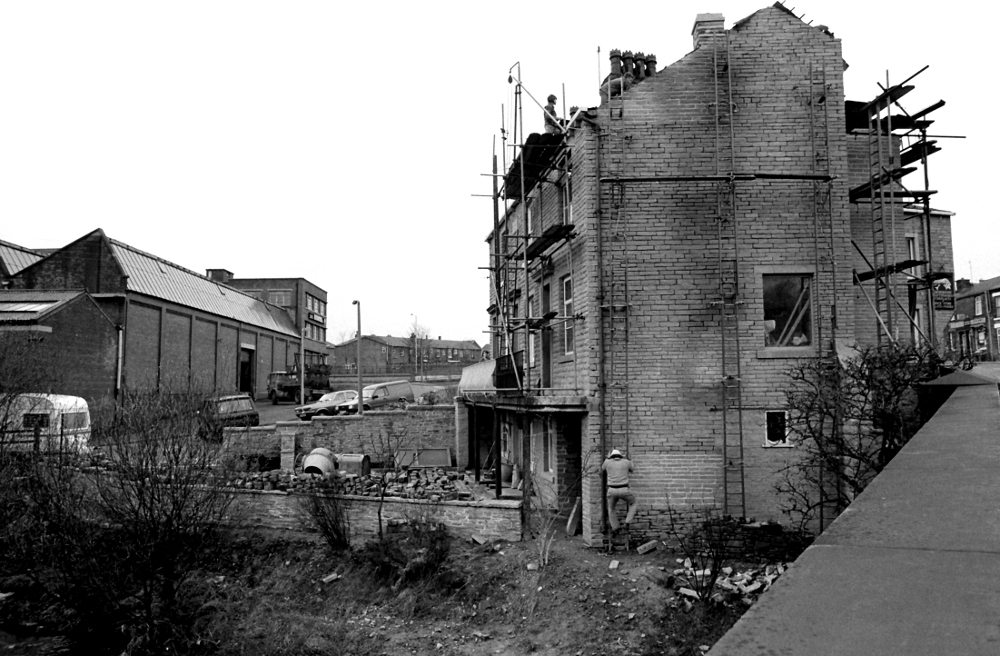 Peter Tatham on the roof, Young Tom descending the ladder on the gable end. Tim's Terrace. Milnrow 1986.