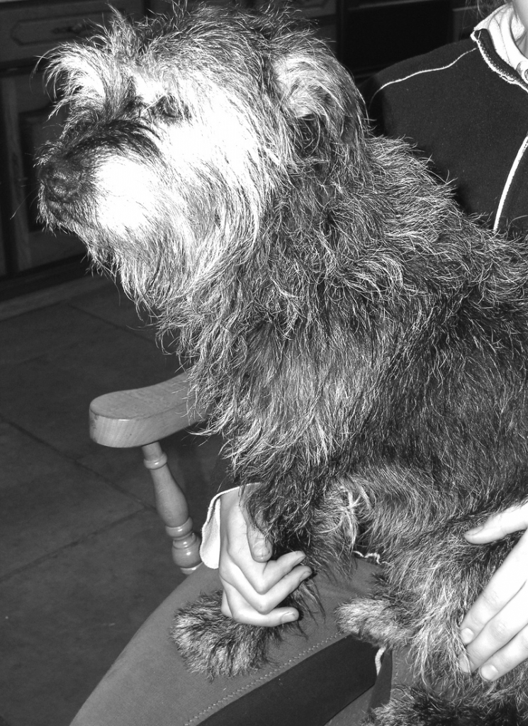 Jet black Patterdales go grey as they get older. Here's my old dog Jess at 13 years.