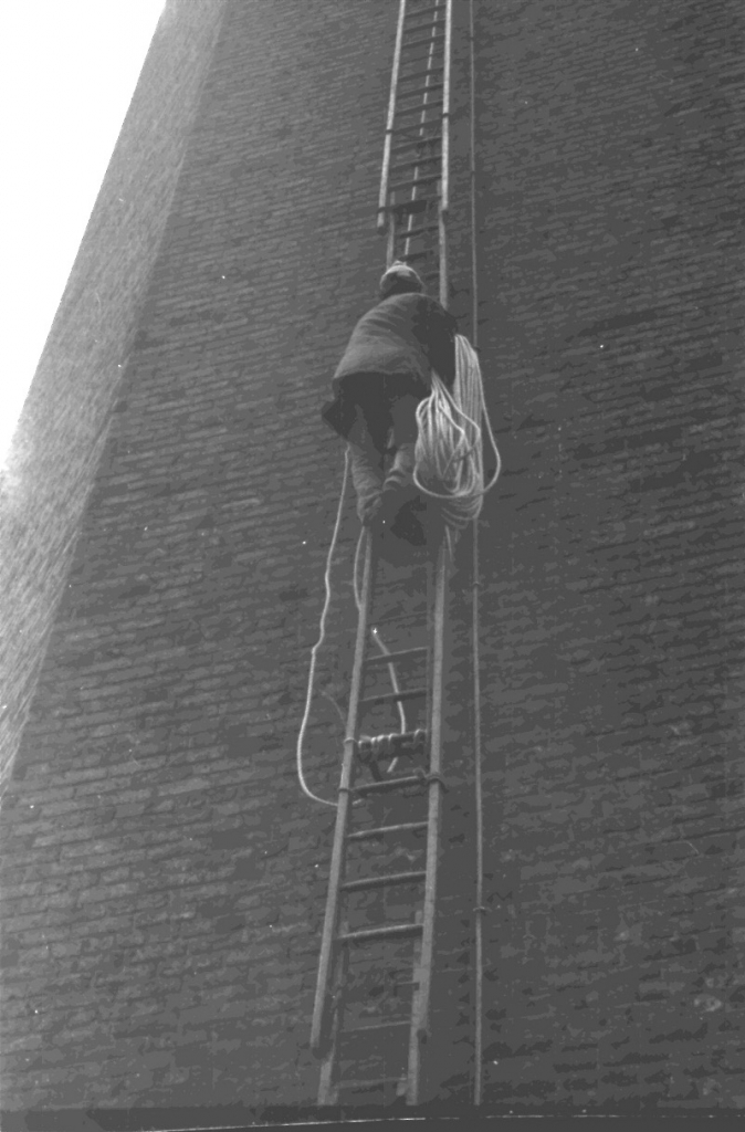 Peter Tatham making his ropes safe for the night on the 340ft Swabs stack in 1976.
