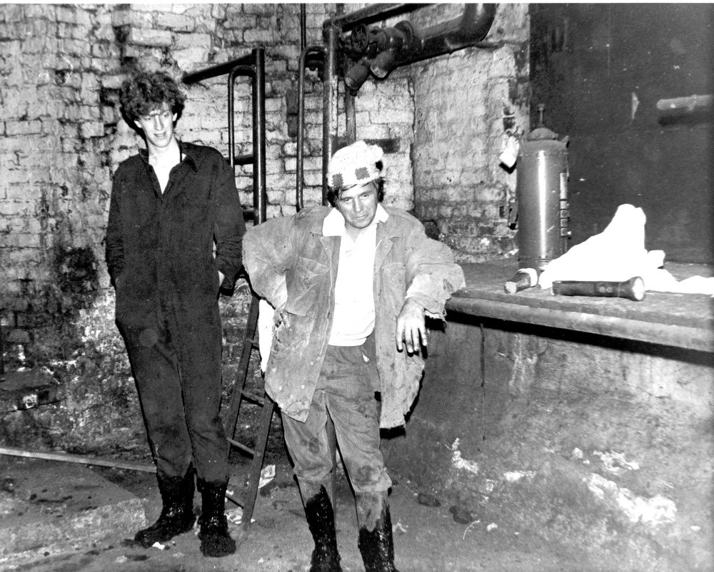 Daniel Meadows and Peter Tatham in the old boiler house at what used to be Simon Schwab's dye works at Middleton after we had been in the flues. Those wellingtons are knackered, the unburnt oil in the dust is eating the rubber away!