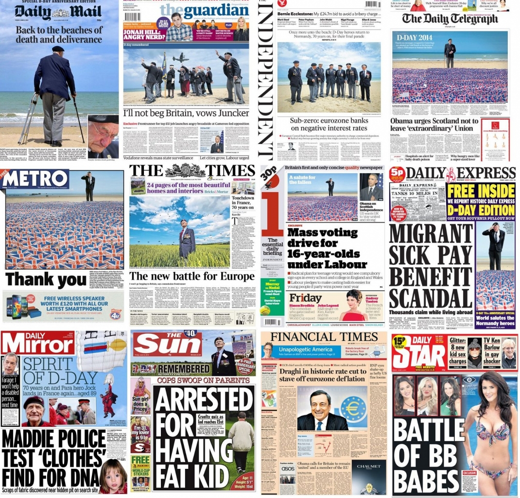 Front pages of 12 British newspapers on 6th June 2014, 70 years after D-Day.