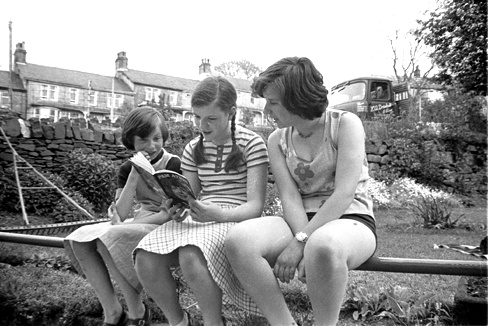 Kids reading poetry (Pam Ayres) at Hey Farm in 1976. In the background there is a Rover hay rake.