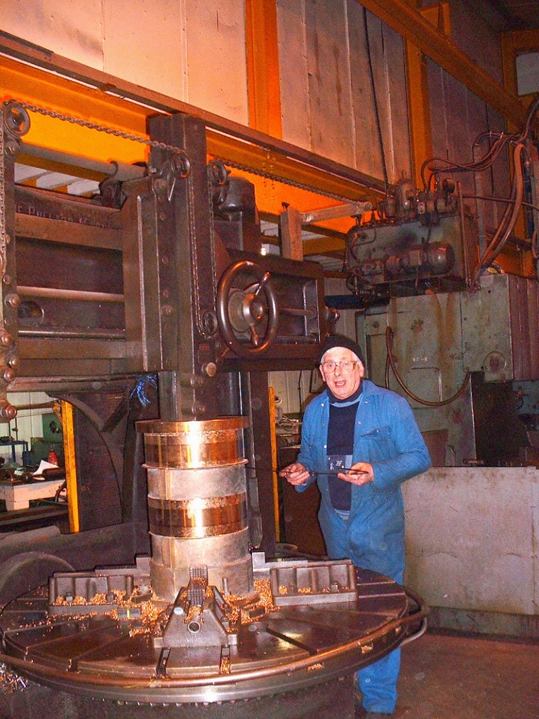 6/01/2004. Brian Robinson, the last B&P apprentice, boring the bottom shells for the pillar bearings on the Jubilee engine at the Havre Park works of Gissing and Lonsdale. The borer is the old American Burril that used to be in the laundry at Wellhouse Mill.