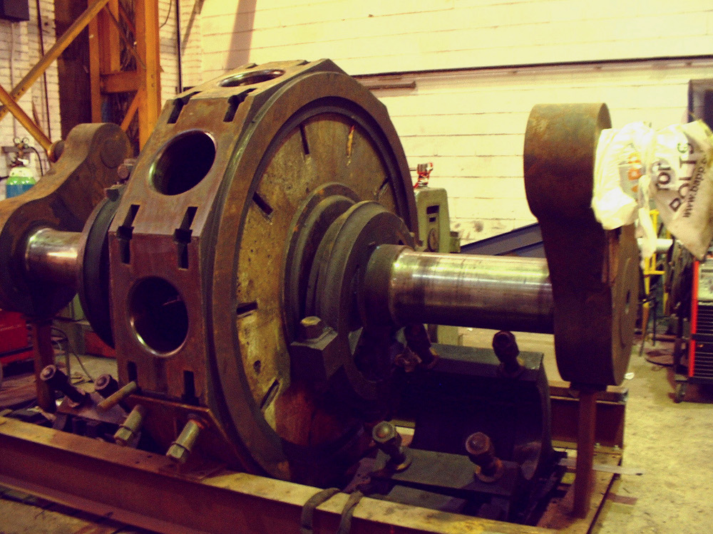 Jubilee engine crankshaft sitting under cover at Gissing and Lonsdale's waiting until it is needed at Masson. Despite the bad condition of the brasses, the journals are in good condition.