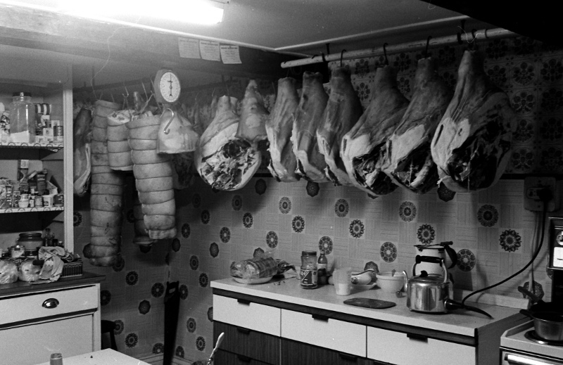Home fed, dry cure bacon and ham hung in the kitchen at Little Stainton.