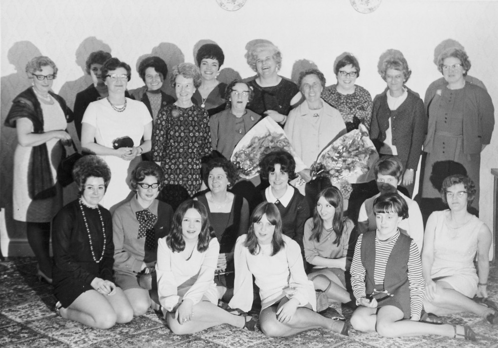 Brown and Pickles works dinner at the Coach and Horses Hotel, Bolton by Bowland, Saturday March 2nd 1970. Front row, kneeling:Mrs L Kay(?). Second row, kneeling; Mrs T Ashby, Mrs Joyce Robinson, Mrs K Smith, Mrs Joyce Pickles, Mrs Bob Fort. Third row, standing: Mrs D. (Robert) Fort, Mrs Gwen Fisher, Mrs Harry Brown, Mrs George Martin, Mrs Harold Wilkinson,. Back row; Mrs Sidney Brown, Mrs Alan Garnett, Mrs Brian Smith, Miss Dorothy Pickles, Miss Sharon ?, Mrs Olive Pickles (Newton's second wife), and ?.