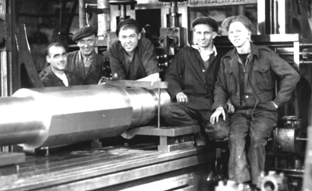 Wellhouse engine fly shaft on the planer at Wellhouse Shop. Date on Picture is 1957 but NP and SCG worked it out at about 1955. Left to right, Charlie Bateman, Harry Crabtree, Brian Smith, Sidney Brown, Roland Harrison.
