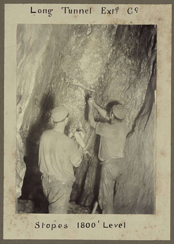Two miners drilling a shothole by the 'hammer and tap' method. Long Tunnel Extended Mine, Walhalla, Victoria, Australia; circa 1880's. Pic courtesy of the State Library of Victoria collection.