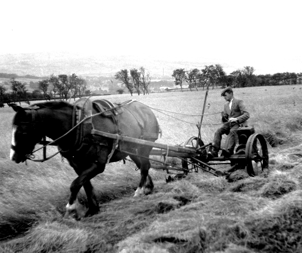 Abel Taylor mowing at Green Bank Farm on Gisburn Old Track in 1956.